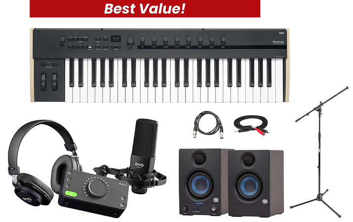 Each "KORG Keystage 49 AP Bundle 2" includes 1) KORG Keystage 49 Poly Aftertouch controller, 1) Audient EVO4 "Start Recording Bundle" (includes one EVO4 audio interface, one EVO condenser microphone with shock mount, EVO SR2000 monitoring headphones, and 8' mic cable), 1) On-Stage MS7701B Euro Boom Mic Stand, and 1) pair of PreSonus Eris 3.5 powered monitors with Bluetooth connectivity.