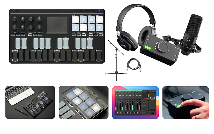The "KORG nanoKEY Studio Audio Production Bundle 1" includes 1) KORG nanoKEY Studio MIDI controller, 1) Audient EVO4 "Start Recording Bundle" (includes one EVO4 audio interface, one EVO condenser microphone with shock mount, EVO SR2000 monitoring headphones, 8' mic cable, and USB cable), and 1) On-Stage MS7701B Euro Boom Mic Stand.